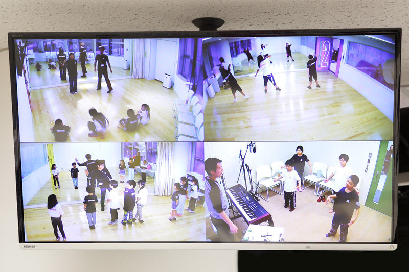 2F事務所では常にモニターでどのようなレッスンが行われているか管理しております。また録画機能も備えております。