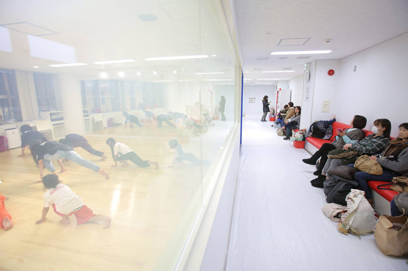 保護者の方がくつろぎながらお子様のレッスンの様子をご覧頂けるように考えた、偏光ガラスを使用したレッスン室。集中しなければならない時などは、ボタンひとつで曇りガラスに切り替えが可能。